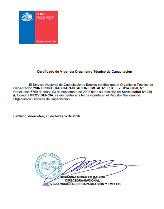 Sin Fronteras Capacitación Ltda. es un Organismo Técnico de Capacitación (OTEC) que nace el año 2008 y que ha implementado un Sistema de Gestión de Calidad que cumple con los requisitos de la Norma Chilena NCh 2728:2015, con el objetivo de prestar servicios de capacitación a diversas empresas bajo la modalidad establecida por el Servicio Nacional de Capacitación y Empleo (SENCE).